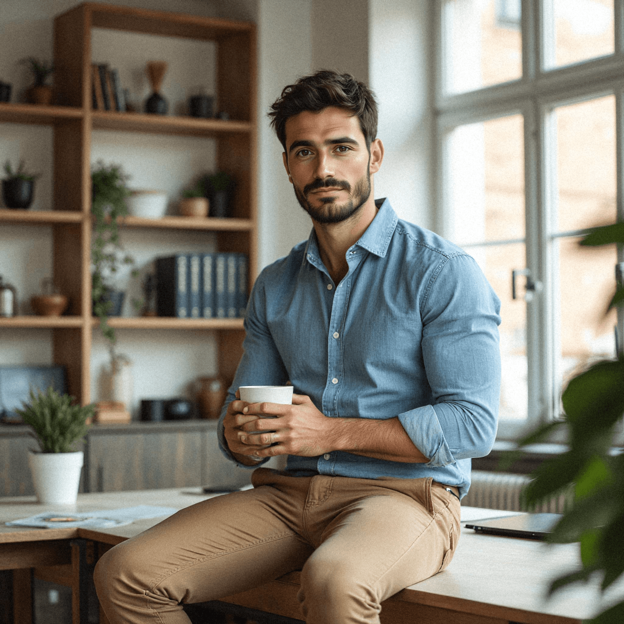 Man in Blue Shirt Holding Coffee Mug