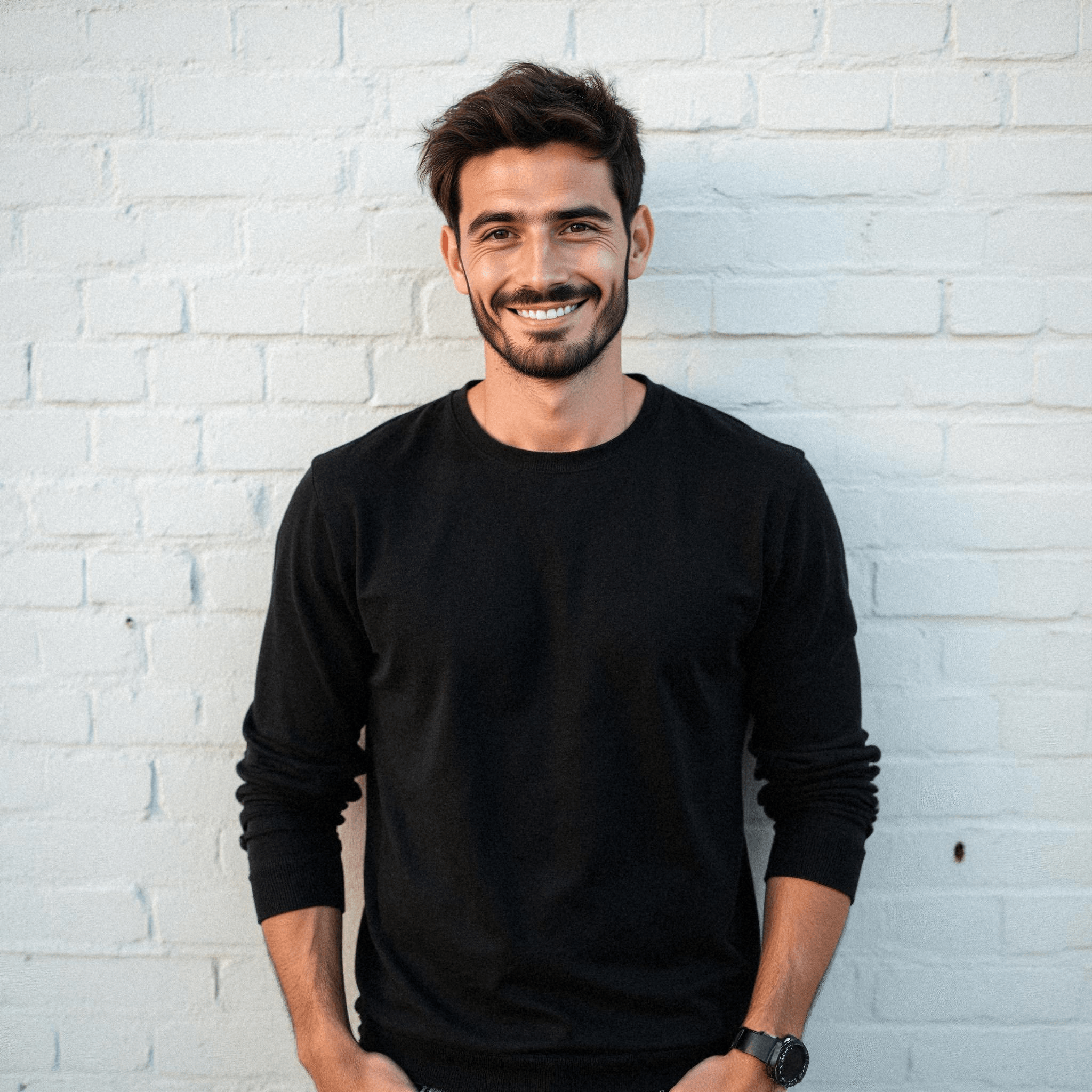 Smiling man in black sweater against brick wall